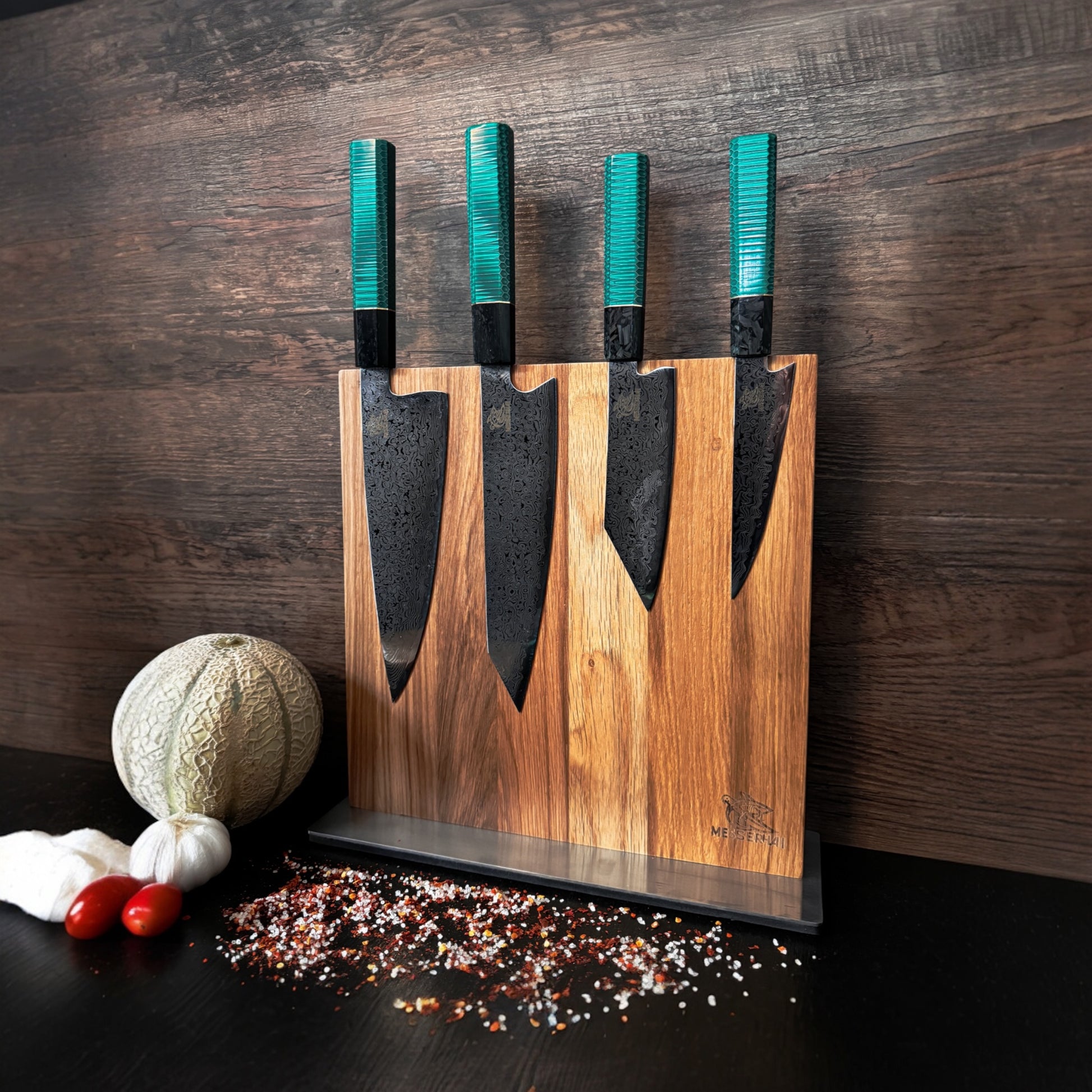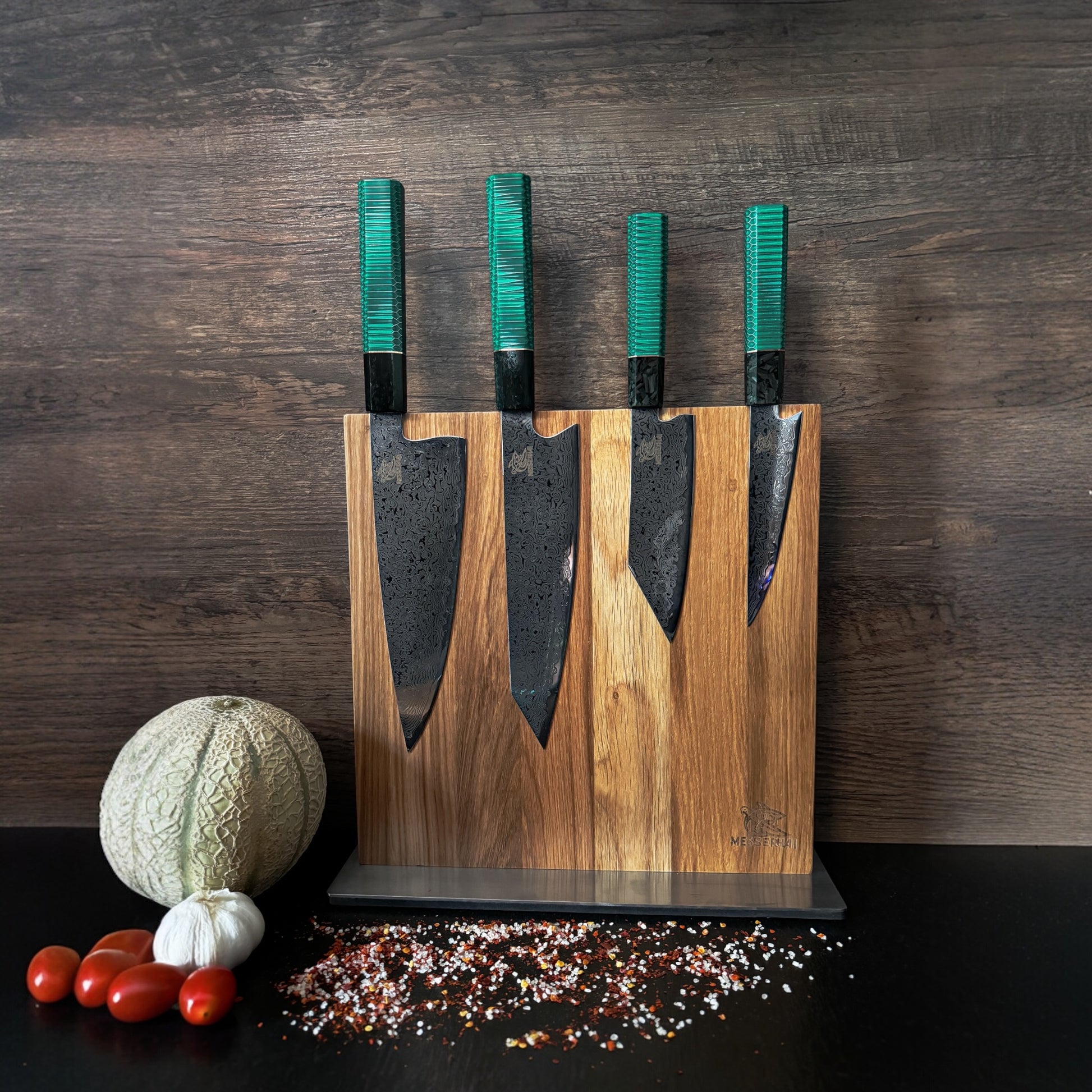 3. Aufbewahrung: Bewahre deine Messer an einem trockenen Ort auf, fern von Feuchtigkeit und direkter Sonneneinstrahlung. Verwende einen Messerhalter, eine Magnetschiene oder spezielle Messerscheiden, um die Klingen zu schützen und sie sicher zu lagern.