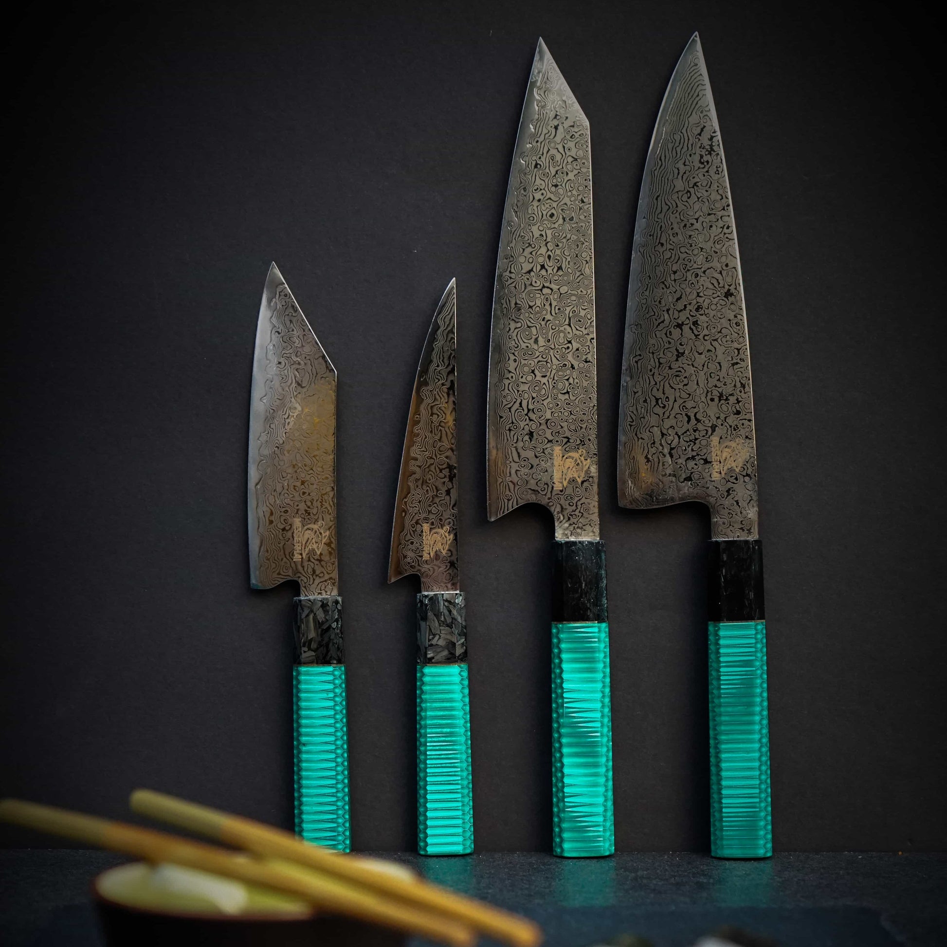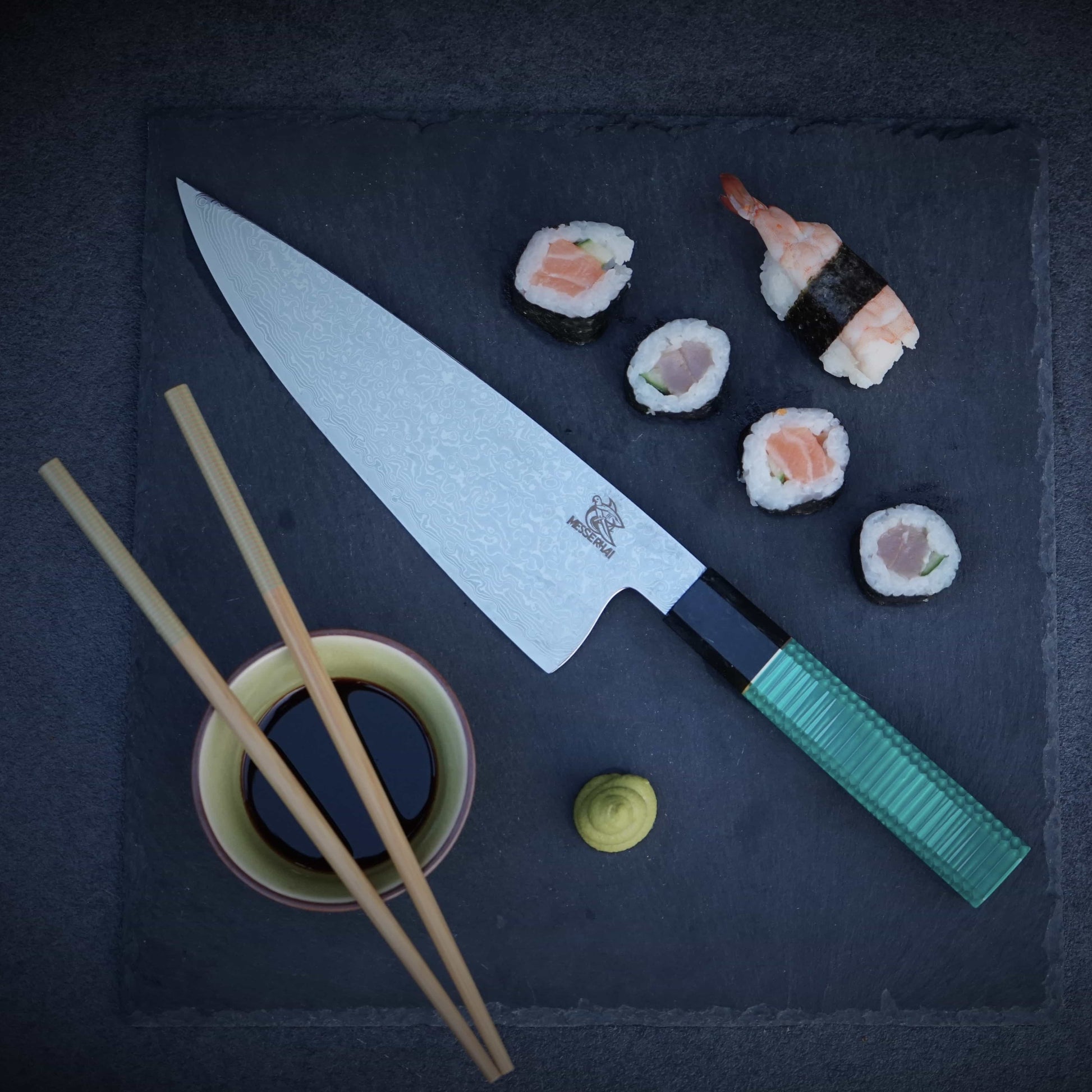Wer Sushi mag, wird Wasabi lieben! Erlebe chirurgische Präzision mit dem Damastmesser-Set Wasabi. Grün und giftig, bestechende Optik und Rasiermesser scharf. Dieses Damastmesser-Set repräsentiert eine Fusion aus altbewährter Schmiedetradition und zeitgenössischem Design. Jede Klinge ist ein Kunstwerk aus 67 Schichten Damaszenerstahl, was nicht nur eine beeindruckende Optik bietet, sondern auch hervorragende Härte und Schnitthaltigkeit garantiert.