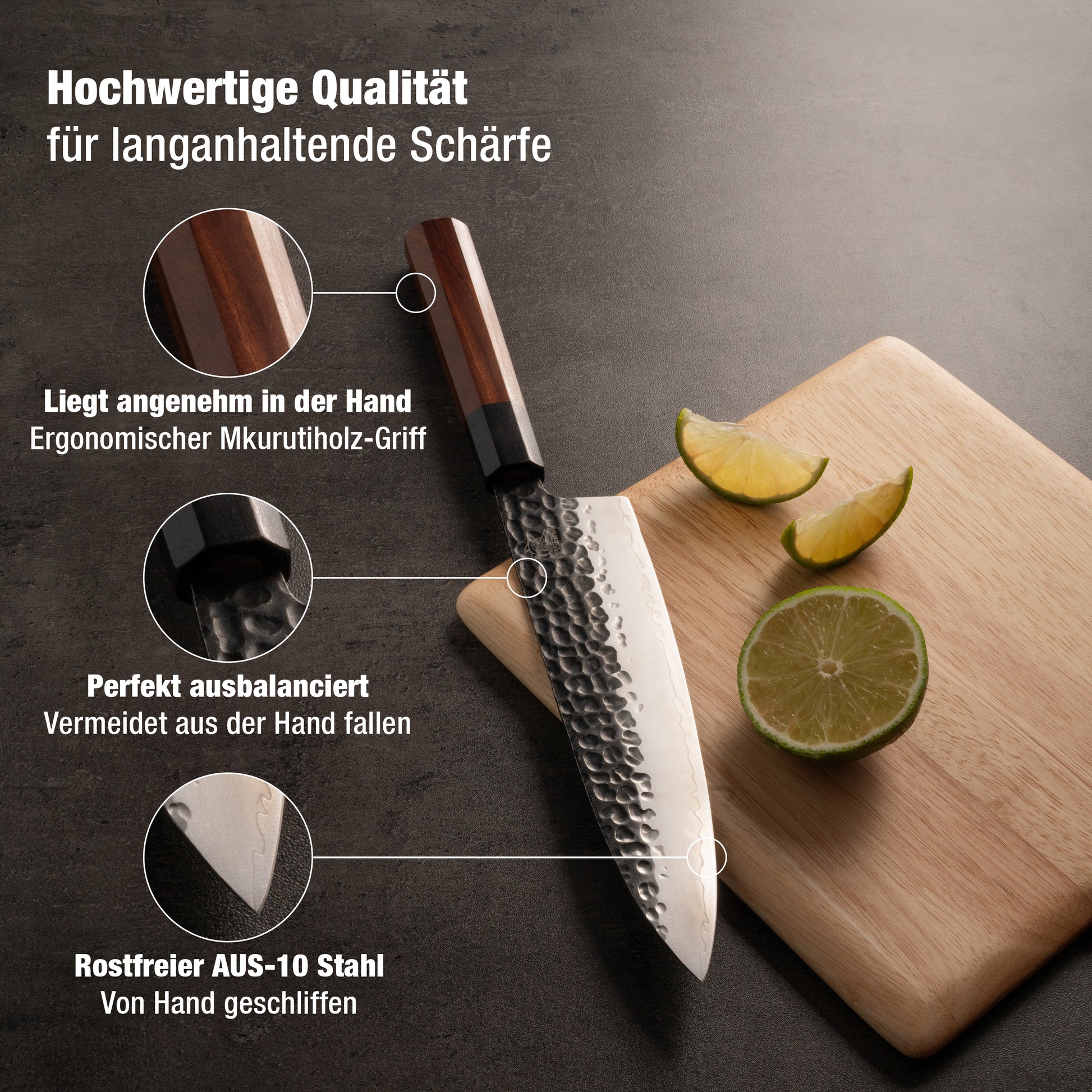 Inaka verleiht deiner Küche und deinen Koch-und Grillkünsten das höchste Level! Es besticht durch gehämmerte Klingen und AUS-10 Kern- genau das Richtige für dich. Mit edlen Mkuruti-Griffen ist Inaka ein absolutes Highlight in deiner Küche und am Grill. Griller lieben es!