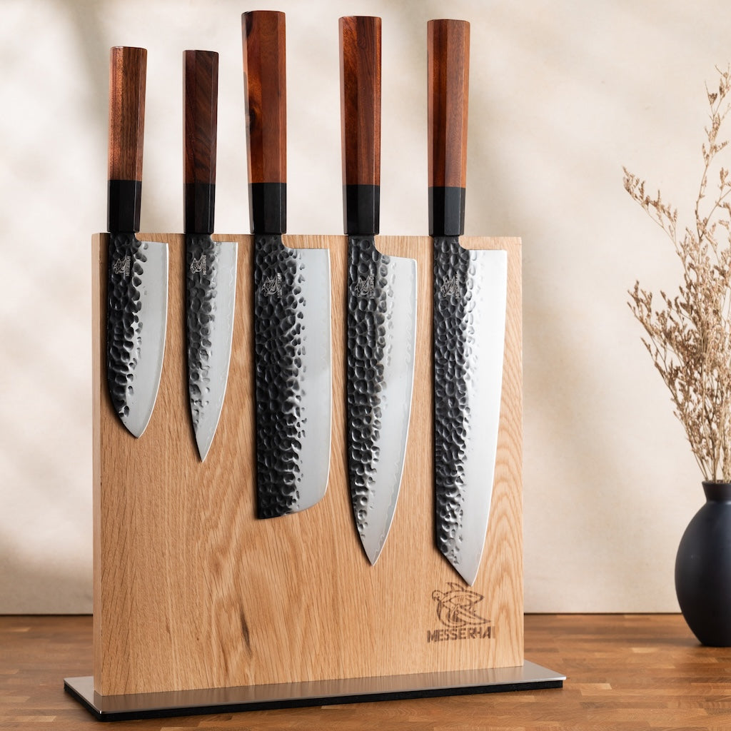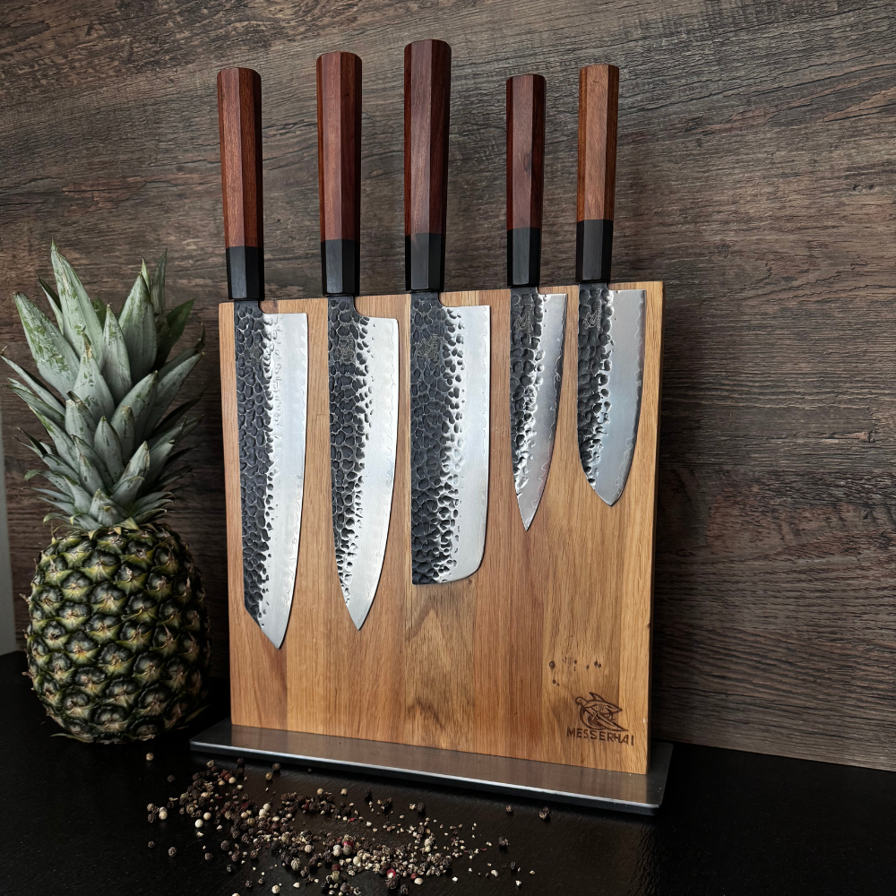 3. Aufbewahrung: Bewahre deine Messer an einem trockenen Ort auf, fern von Feuchtigkeit und direkter Sonneneinstrahlung. Verwende einen Messerhalter, eine Magnetschiene oder spezielle Messerscheiden, um die Klingen zu schützen und sie sicher zu lagern.