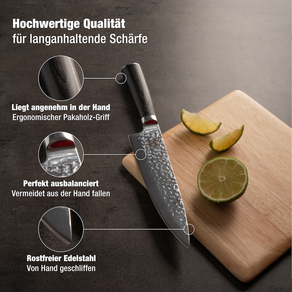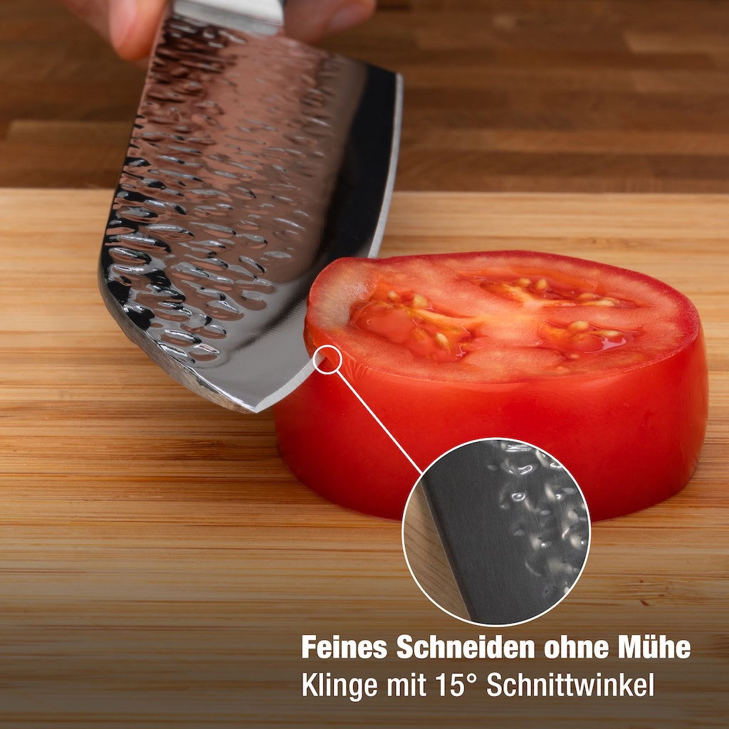 Neu und einzigartig! Leicht schneiden, sauber arbeiten, kaum Anhaftungen. Dank der gehämmerten und rasiermesserscharfen Klinge gleitet dieses geschmiedete Küchenmesser mühelos durchs Schneidgut-mit weniger Druck und kaum Anhaftungen an der Klinge. Präzision und Komfort beim Schneiden, vereint mit perfekter Balance des Messers in deiner Hand.