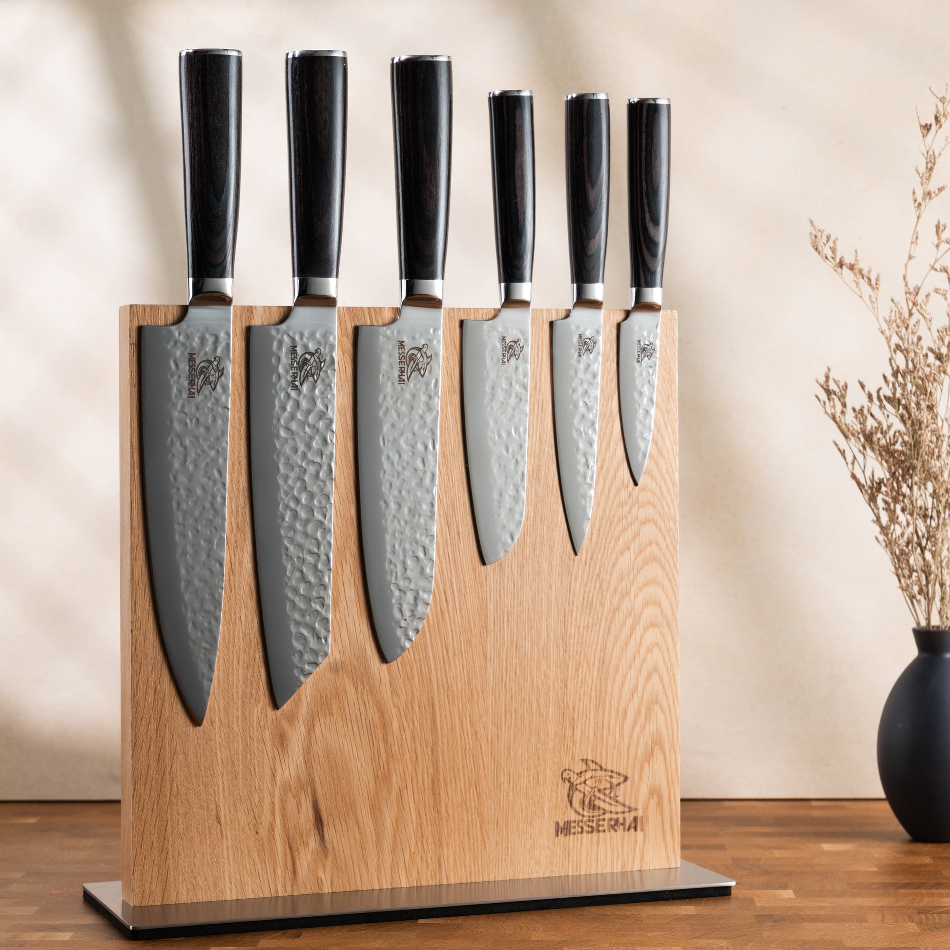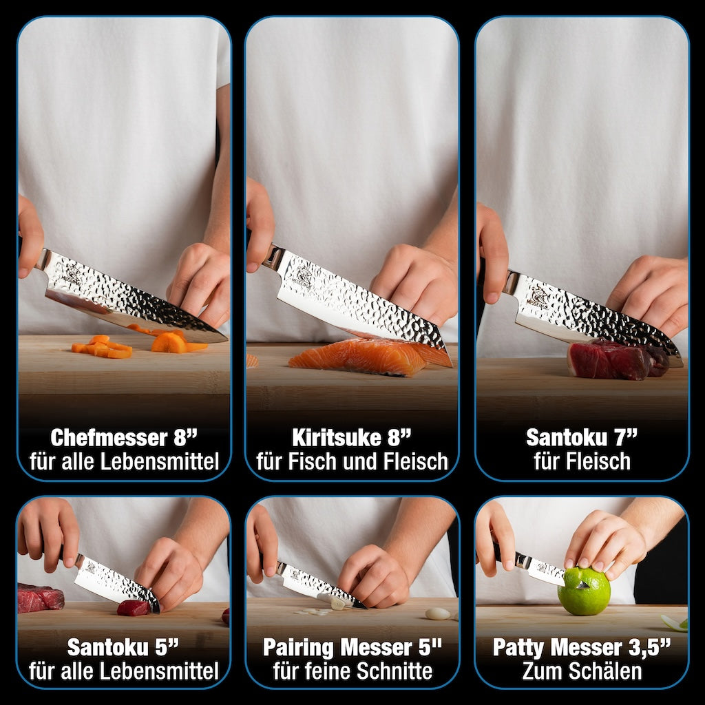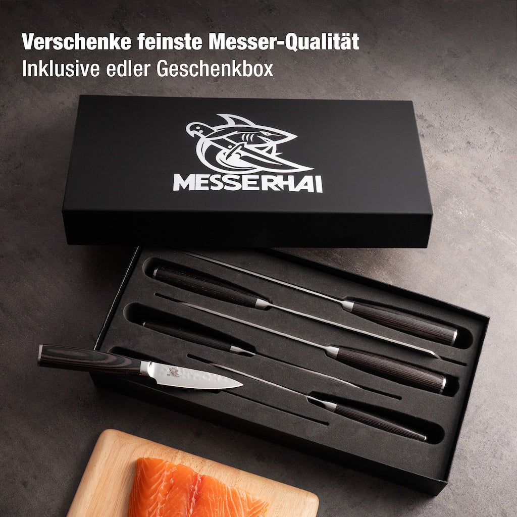 MesserHai-Messer aus rostfreiem Stahl oder Damast garantieren Langlebigkeit und leichte Pflege. Achte darauf, dass die Messer gut in der Hand liegen und nicht zu schwer sind. Für Anfänger kann es auch sinnvoll sein, ein Messerset zu wählen, das die wichtigsten Messertypen beinhaltet. MesserHai hat hierfür optimierte Messersets.