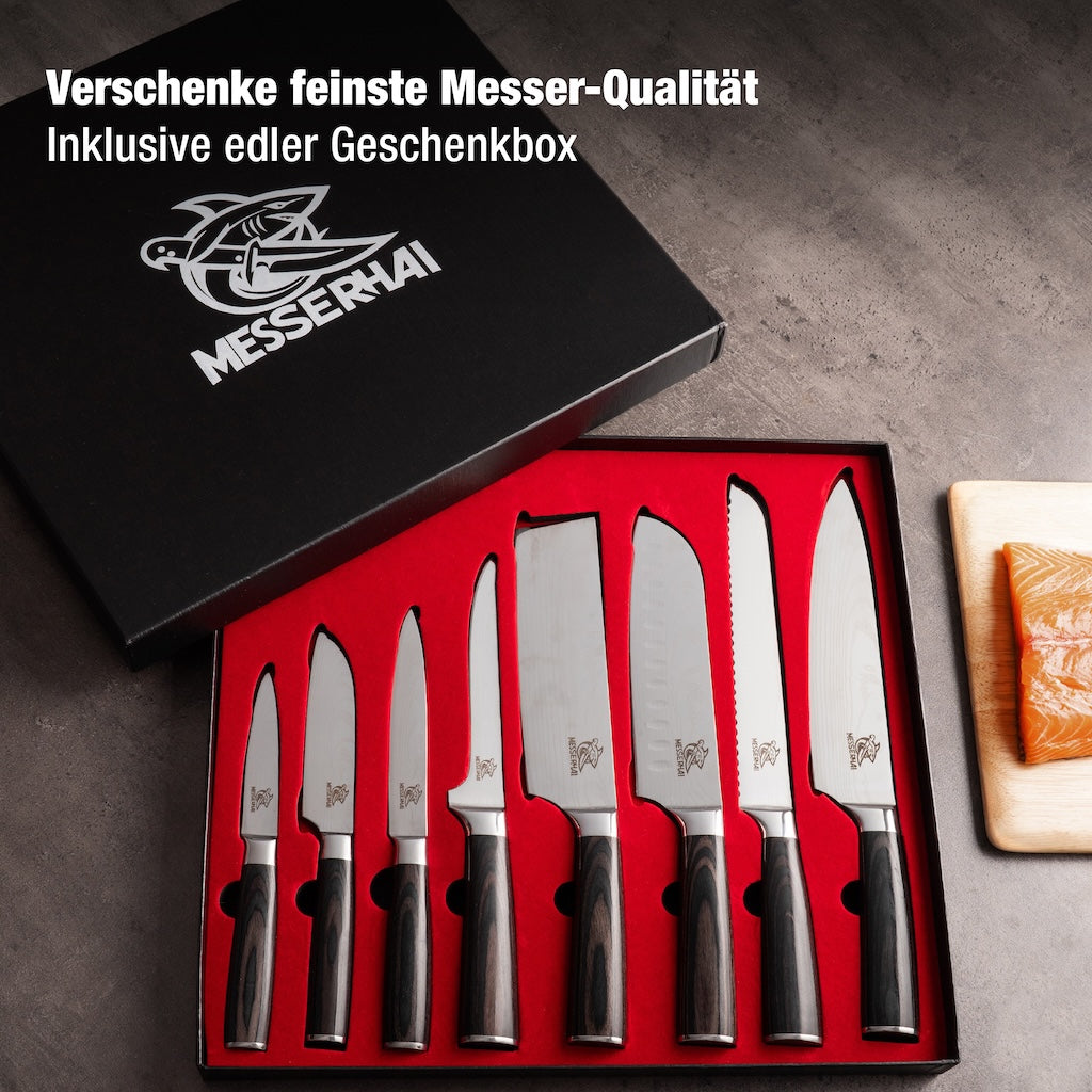 MesserHai-Messer aus rostfreiem Stahl oder Damast garantieren Langlebigkeit und leichte Pflege. Achte darauf, dass die Messer gut in der Hand liegen und nicht zu schwer sind. Für Anfänger kann es auch sinnvoll sein, ein Messerset zu wählen, das die wichtigsten Messertypen beinhaltet. MesserHai hat hierfür optimierte Messersets.