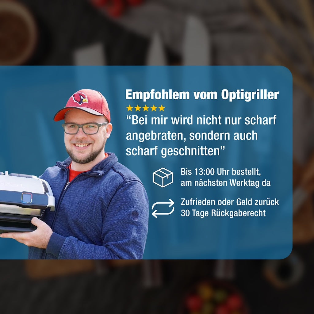 "Mit dem Set seid ihr super ausgestattet und habt eure scharfen Messer jederzeit griffbereit" sagt der OptiGriller